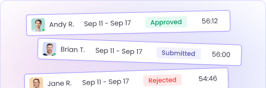 Проверяйте и утверждайте сотни табелей за минуты. Настройте автоматические правила, отмечайте аномалии и отправляйте утверждённые табели прямо в вашу систему зарплат, например Deel. Без экспорта и импорта — WebWork синхронизирует данные автоматически.