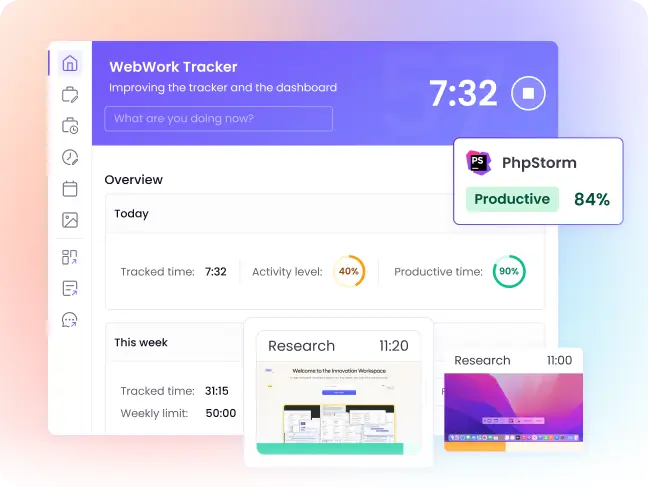 Оценивайте продуктивность по отработанному времени, уровню активности и использованию приложений/сайтов.