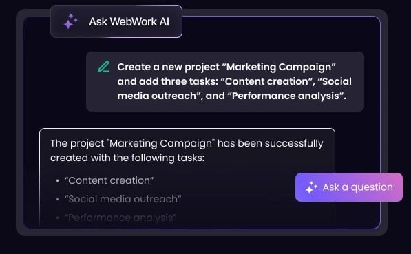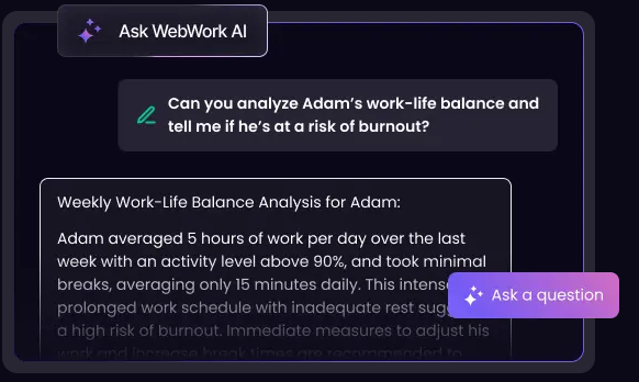 And much like Generative AI chatbots, I can ask WebWork AI questions about work, like project timelines or my team’s performance and productivity.