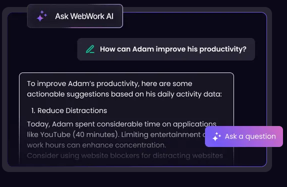 Find solutions with WebWork AI. Receive data-driven suggestions on how to improve employee productivity.