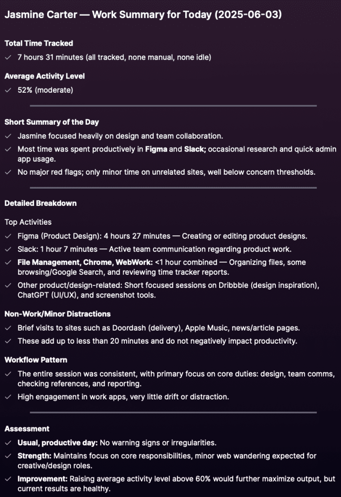 Real Output from WebWork AI: Workday Breakdown.