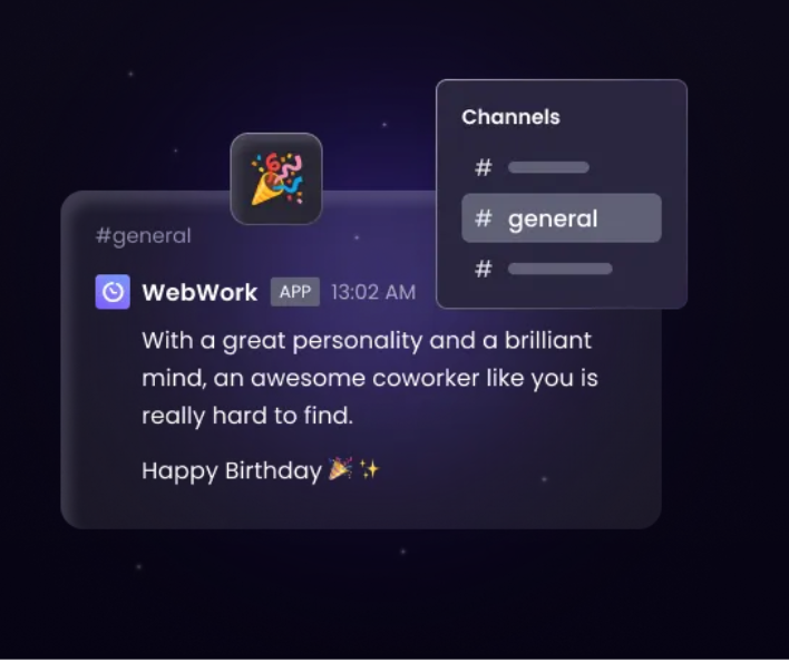 Birthday greetings. WebWork’s AI Assistant celebrates your teammates’ birthdays right on time, with cheerful messages sent directly to your Slack or WebWork Chat.