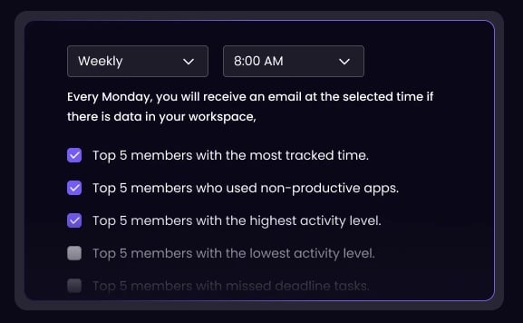 I can ask WebWork AI to send me automated emails on my team’s productivity and activity level — at any hour and day of the week I choose.