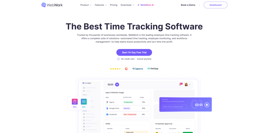 Overview: WebWork delivers the most comprehensive solution for staffing agencies, combining robust time tracking with flexible employee monitoring, screenshots, activity tracking, and built-in productivity analytics—all at an exceptional value.